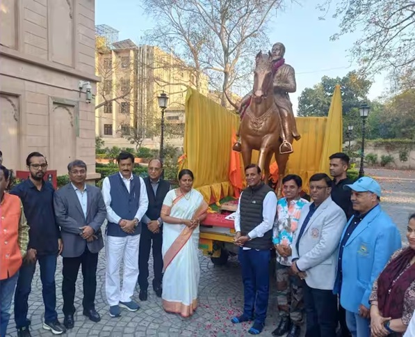 नवी दिल्ली, 2 : भारतीय शौर्याचे प्रतीक आणि कोट्यवधी भारतीयांचे आराध्य दैवत छत्रपती शिवाजी महाराज यांचा भव्य अश्वारूढ पुतळा आता जम्मू-काश्मीरमधील भारत-पाकिस्तान सीमेवर असलेल्या पुंछ येथे दिमाखात उभा राहणार आहे. या ऐतिहासिक सोहळ्यानिमित्त पुणे येथून निघालेली भव्य ‘शिवस्वराज्य यात्रा’ राजधानी दिल्लीतील महाराष्ट्र सदनात दाखल झाली. यावेळी ‘जय भवानी, जय शिवाजी’च्या जयघोषात या रथाचे आणि शिवरायांच्या पुतळ्याचे अत्यंत उत्साहात जंगी स्वागत करण्यात आले.