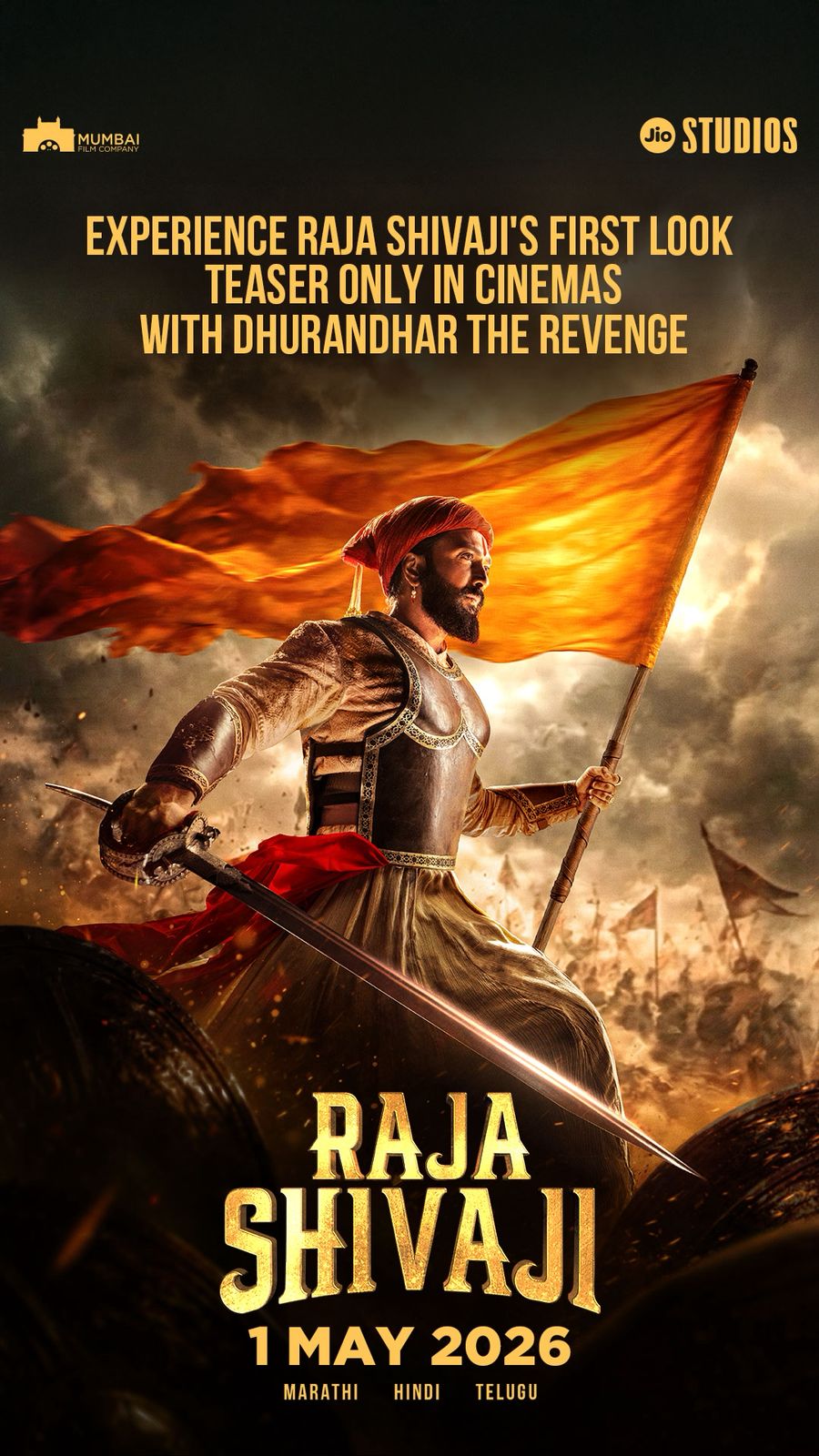 जिओ स्टुडिओज आणि मुंबई फिल्म कंपनी प्रस्तुत बहुप्रतिक्षित चित्रपट ‘राजा शिवाजी’ चा दमदार फर्स्ट लूक टीझर आता प्रेक्षकांसमोर येणार असून, हा खास अनुभव केवळ चित्रपटगृहांमध्येच पाहायला मिळणार आहे. विशेष म्हणजे हा फर्स्ट लूक टीझर ‘धुरंधर-द रिव्हेंज’ या चित्रपटाच्या प्रदर्शनासोबत दाखवण्यात येणार आहे. त्यामुळे १८ मार्चपासून सुरू होणाऱ्या सशुल्क प्रिव्ह्यूद्वारेही प्रेक्षकांना या भव्य ऐतिहासिक चित्रपटाची पहिली झलक पाहण्याची संधी मिळणार आहे.